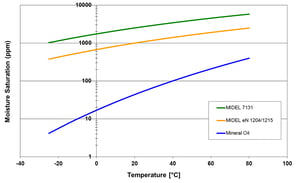They have a higher saturation point – and are more tolerant of water – than mineral oil. A comparison of the saturation curves of different fluids is shown below.